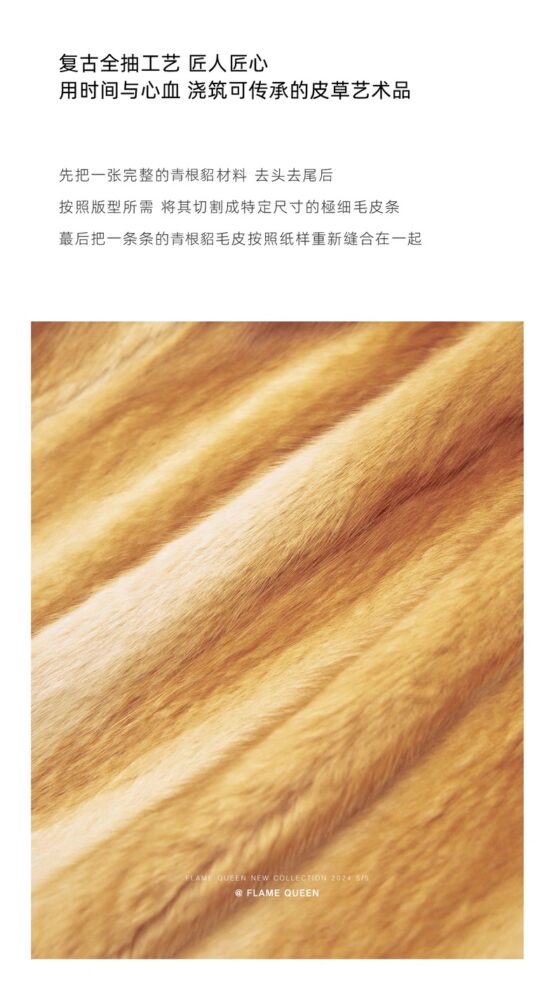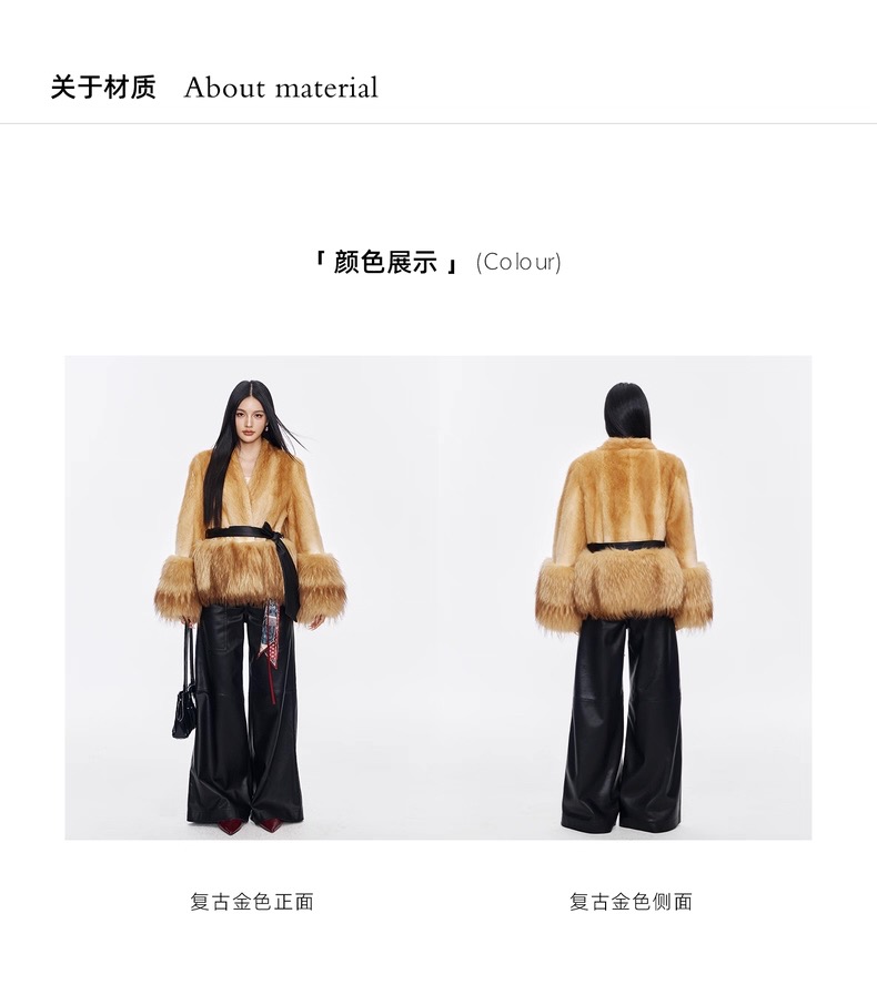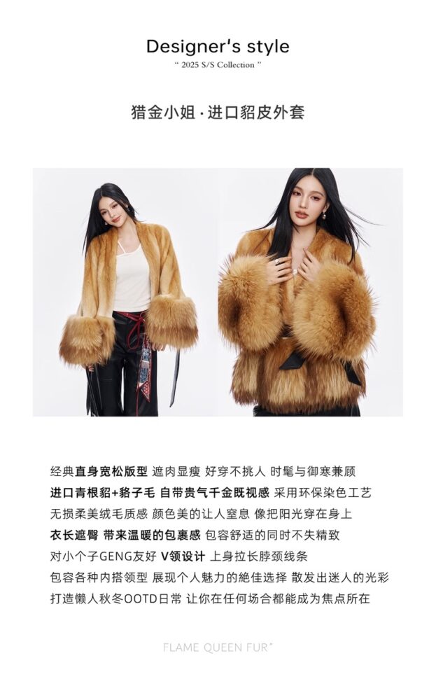 Kiểu dáng suông cổ điển, dáng rộng, tôn dáng và ôm sát, dễ mặc, phù hợp với mọi vóc dáng, kết hợp giữa phong cách và sự ấm áp. Lông chồn và lông gấu trúc nhập khẩu mang đến cảm giác sang trọng. Quy trình nhuộm thân thiện với môi trường