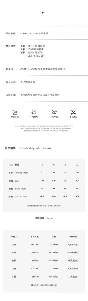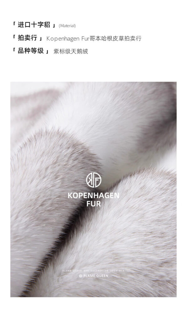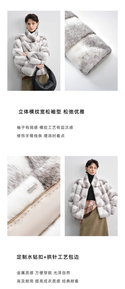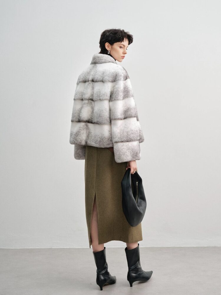 Chiều dài áo chạm đến hông, tôn lên vóc dáng cao ráo, thanh mảnh. Chi tiết xẻ tà ngang tinh tế và màu sắc tự nhiên của lông chồn được tôn lên tối đa.